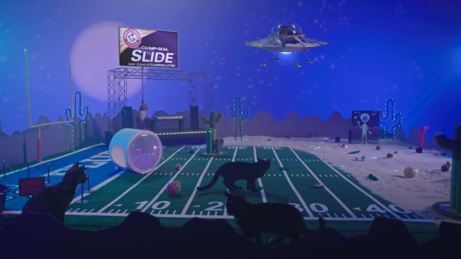 It’s an out-of-this-world disco in the desert! This year’s Kitty Halftime Show is getting a visit from outer space featuring a custom cat-sized UFO, neon cacti, lasers, and a special musical purr-formance.